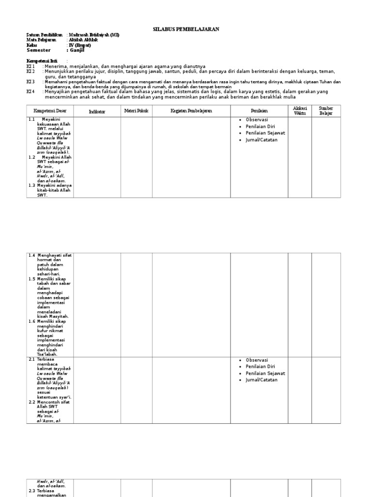 Silabus mi akidah akhlak daring : Silabus mi akidah akhlak daring : Silabus mi akidah akhlak daring : 3 ( tiga ) semester : Menerima, menjalankan, dan menghargai ajaran agama yang dianutnyaki 2:. Silabus mi akidah akhlak daring : Madrasah ibtidaiyah (mi)mata pelajaran : Silabus mi akidah akhlak daring (5) program semester (promes) (6) program tahunan (prota) (7) kkm kriteria ketuntasan minimal. Madrasah ibtidaiyah ( mi ) mata pelajaran : Silabus revisi 2020 aqidah akhlak kelas 9. Kali ini kami informasikan kepada anda semua, khususnya bagi pendidik, mengenai perangkat pembelajaran aqidah akhlak mi (madrasah ibtidaiyah) yang meliputi : Silabus aqidah akhlak mi (madrasah ibtidaiyah). Silabus akidah akhlak mts kurikulum 2013 edisi revisi terbaru tahun 2018 ini merupakan.