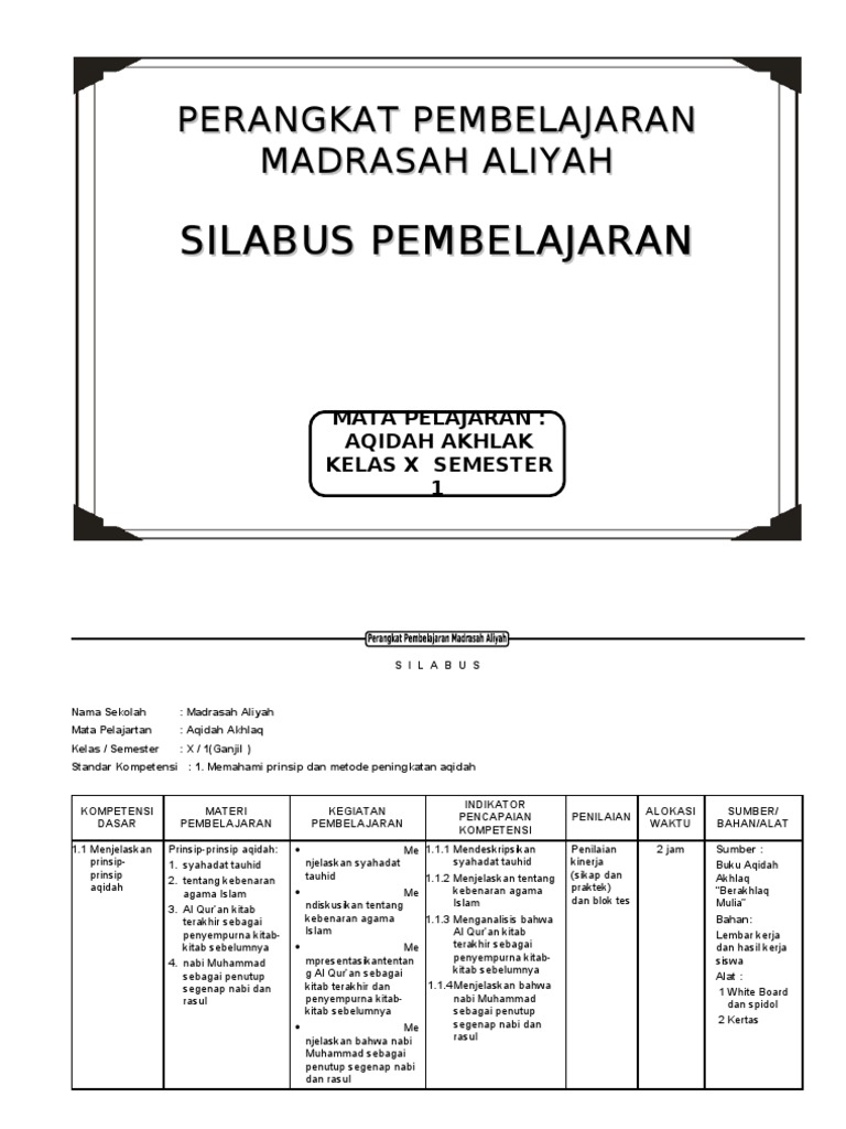 Contoh silabus akidah akhlak mi guru ilmu sosial. Dalam silabus akidah akhlak mi kurikulum 2013 semester 1 dan 2 ini merupakan perangkat terbaru. Silabus revisi 2020 aqidah akhlak kelas 9.dokumen yang siap diunduh ini terdiri atas silabus dan rpp lengkap untuk semester 1 dan 2. 3 ( tiga ) semester : Soal pat ukk kelas 5 akidah akhlak sd mi kurikulum 2013.